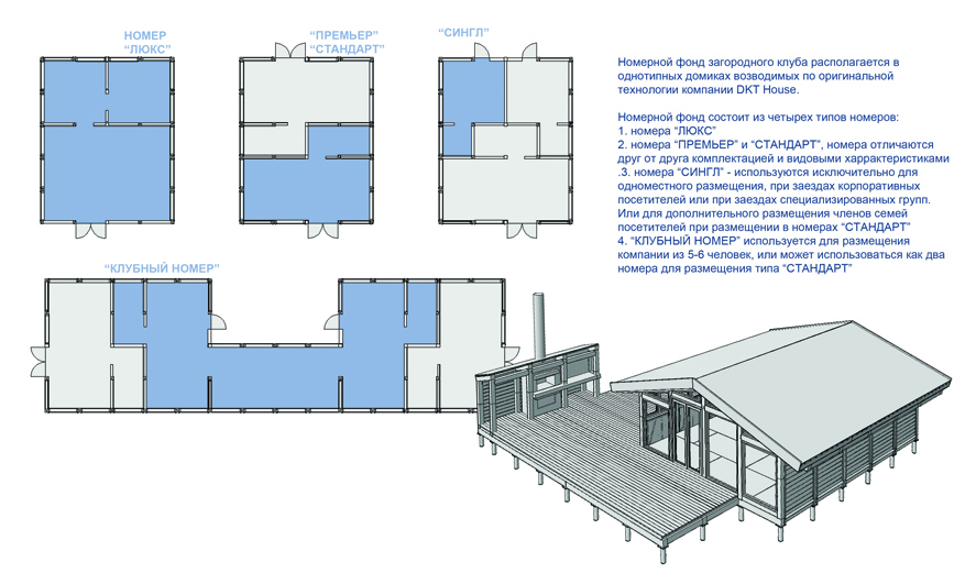 В структуру базы отдыха входят отдельно стоящие объекты - номерной фонд, многофункциональный павильон и здание ресторана. Комплекс направлен на проведение загородного семейного отдыха, а существующее центральное ядро из ресторана и детской площадки заставит семью провести замечательные выходные вдали от города. Комплекс предусматривает разные варианты размещения для семей, пар, а также отдыха больших компаний, для этого существует несколько вариантов размещения в номерном фонде: номера "люкс" наличие спальни, гостиной и ванной комнаты; номера "стандарт" наличие спальни и ванной комнаты; номера "сингл" используются для одноместного размещения, в основном при заездах корпоративных посетителей или специализированных групп; "клубные номера" для размещения компаний 5-6 человек или совместное пространства при размещении типа "стандарт". Проект развивает популярную тенденцию проведения различных мероприятий вдали от города в природном ландшафте на территории залива. Многофункциональный павильон можно использовать для проведения всевозможных фестивалей, лекций, воркшопов, что дает возможность совмещать интересную насыщенную программу с природным экологическим расположением загородного клуба.