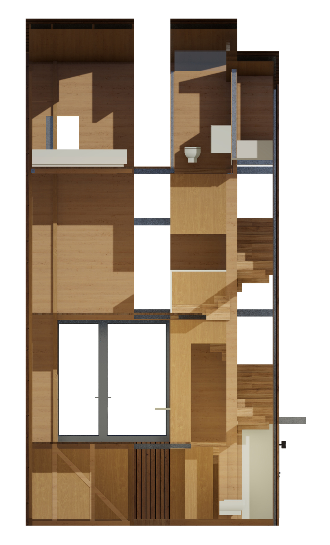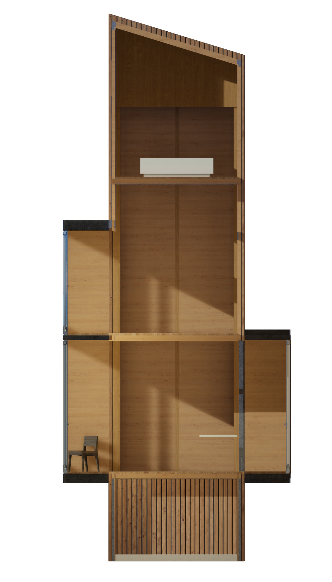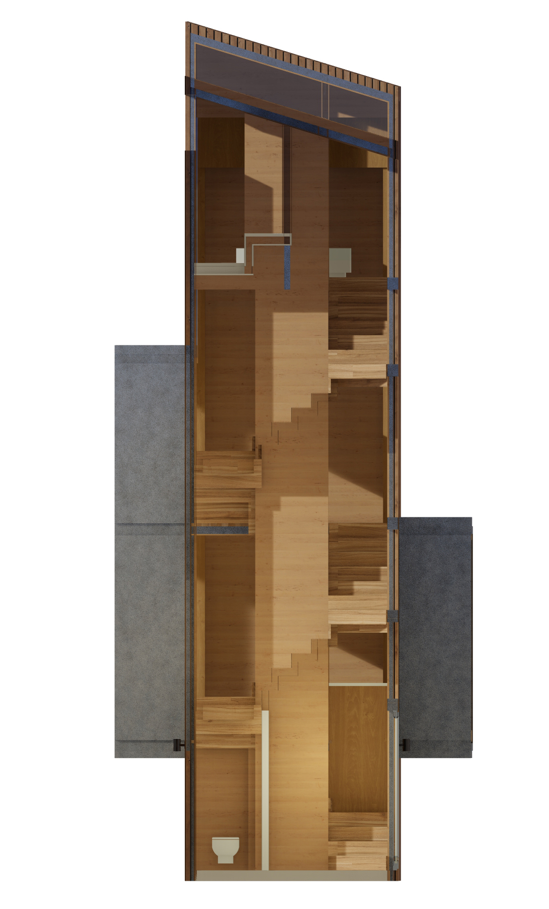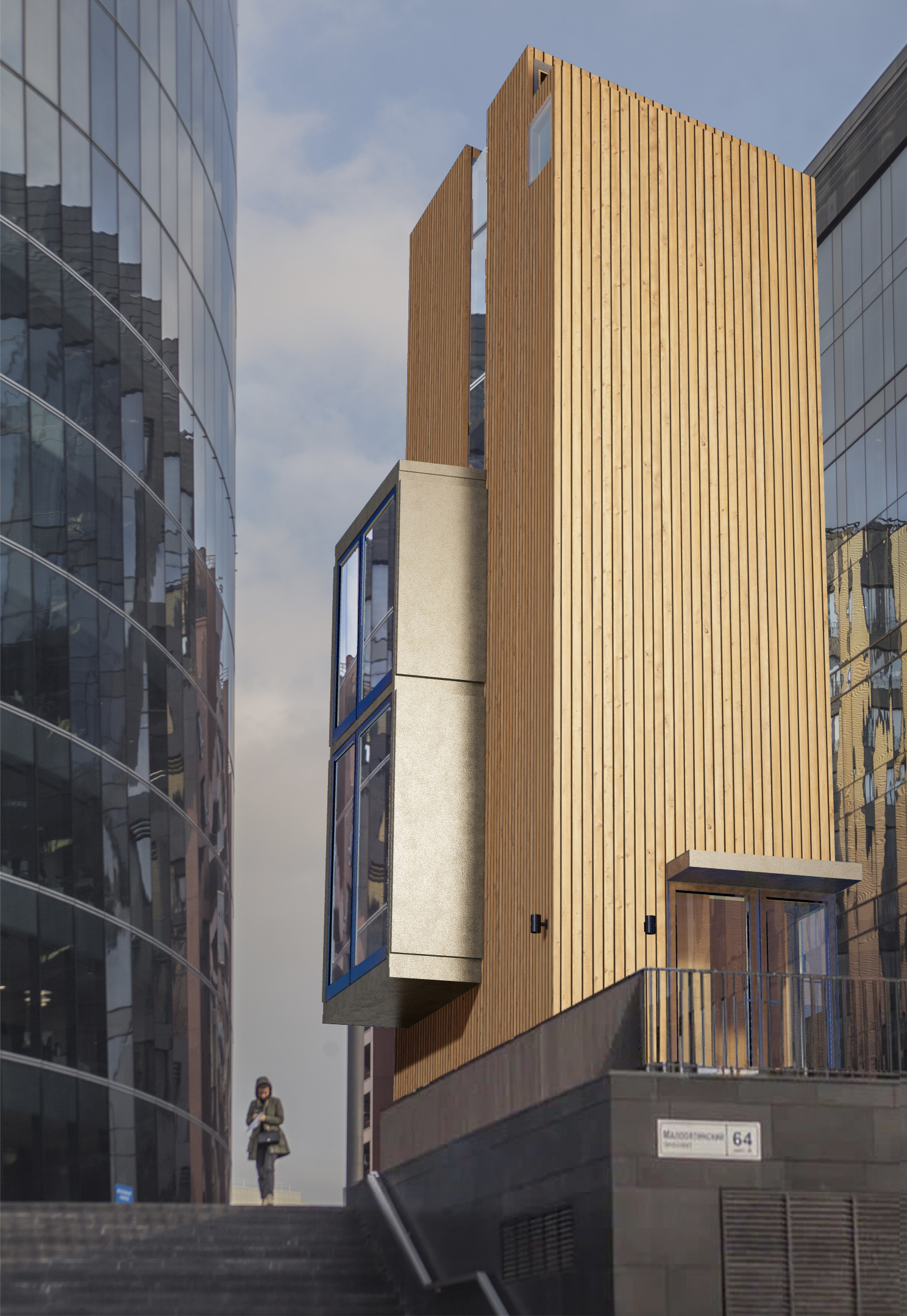 Расположение жилых помещений по вертикали над инженерным уровнем даёт ощущение комфорта и защищённости при установке дома в урбанистической среде.