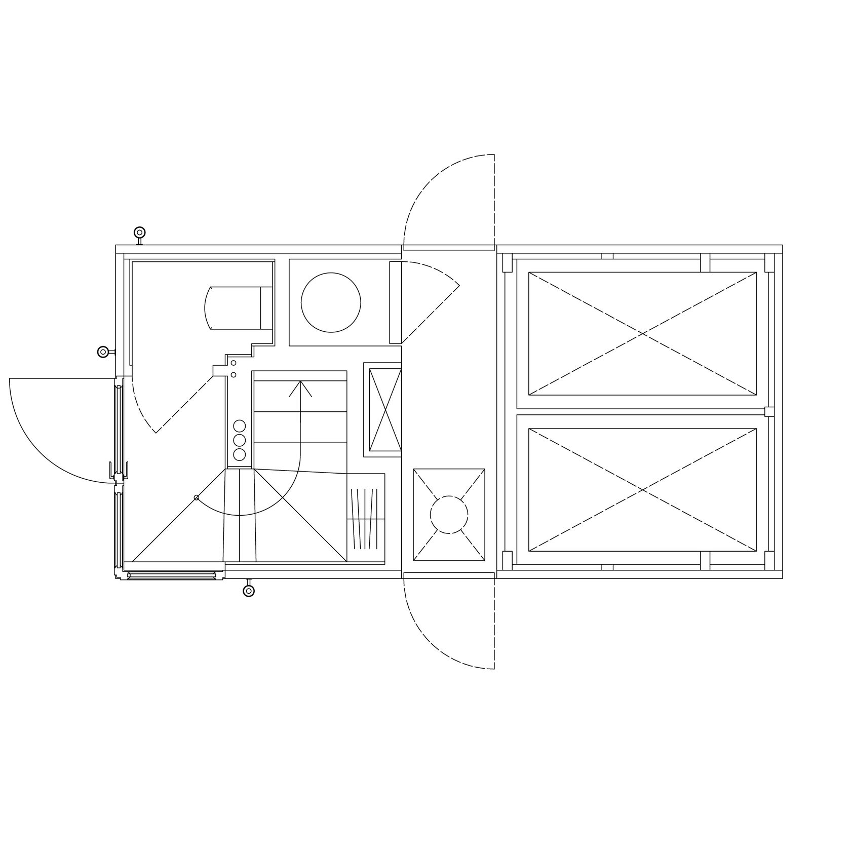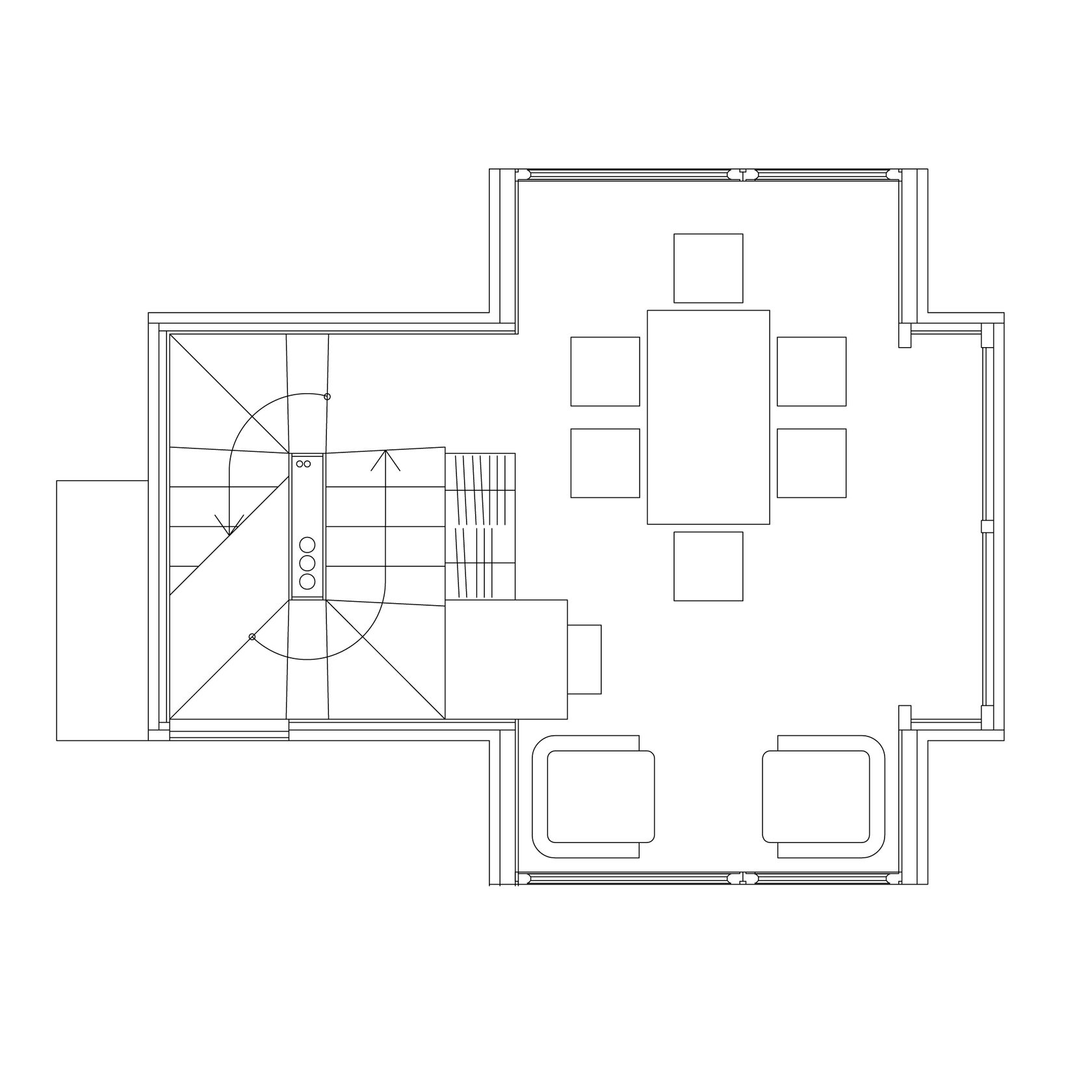 1‑й этаж рабочее помещение; кабинет, переговорная, мастерская-студия. Возможность принимать посетителей, гостевой санузел на нулевом уровне.