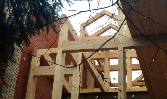 Несущий остов здания выполнен из керамических блоков толщиной 250мм с облицованный кирпичом и конструкций кровли из клееного бруса сечением 160х120 и 120х270.