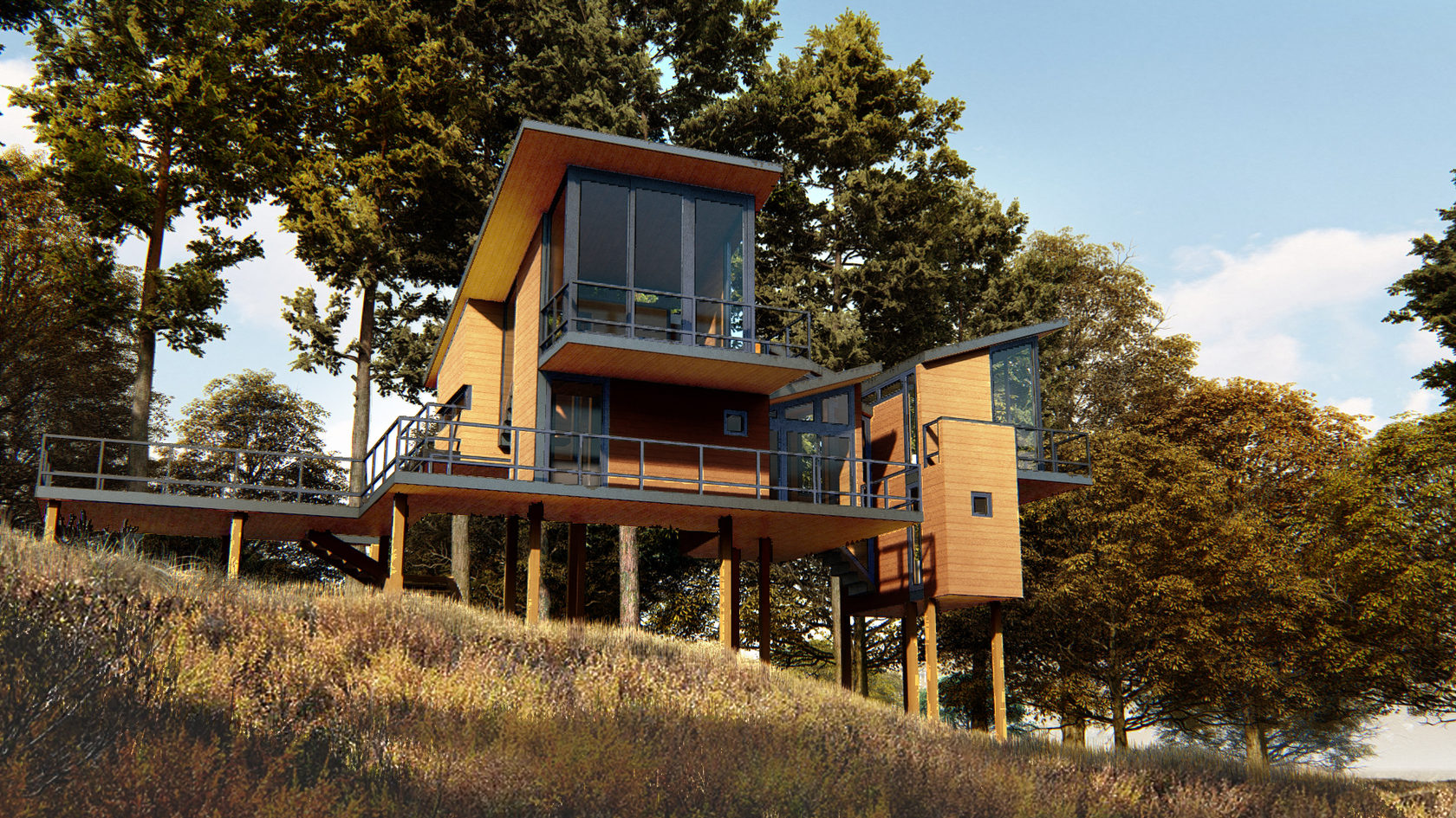 Проект разработан для туристического размещения на территориях национальных парков, природоохранных зон, на землях в пойме рек на подтопляемых участках. Размещение домов на сваях, дает возможность минимального влияния пребывания человека в зонах особо охраняемых территорий и рекреационных зон, на окружающую среду. Модульность конструкции дома, позволяет монтировать строение в сжатые сроки, а так же дает возможность оперативного демонтажа строения с переносом в другое место размещения.
